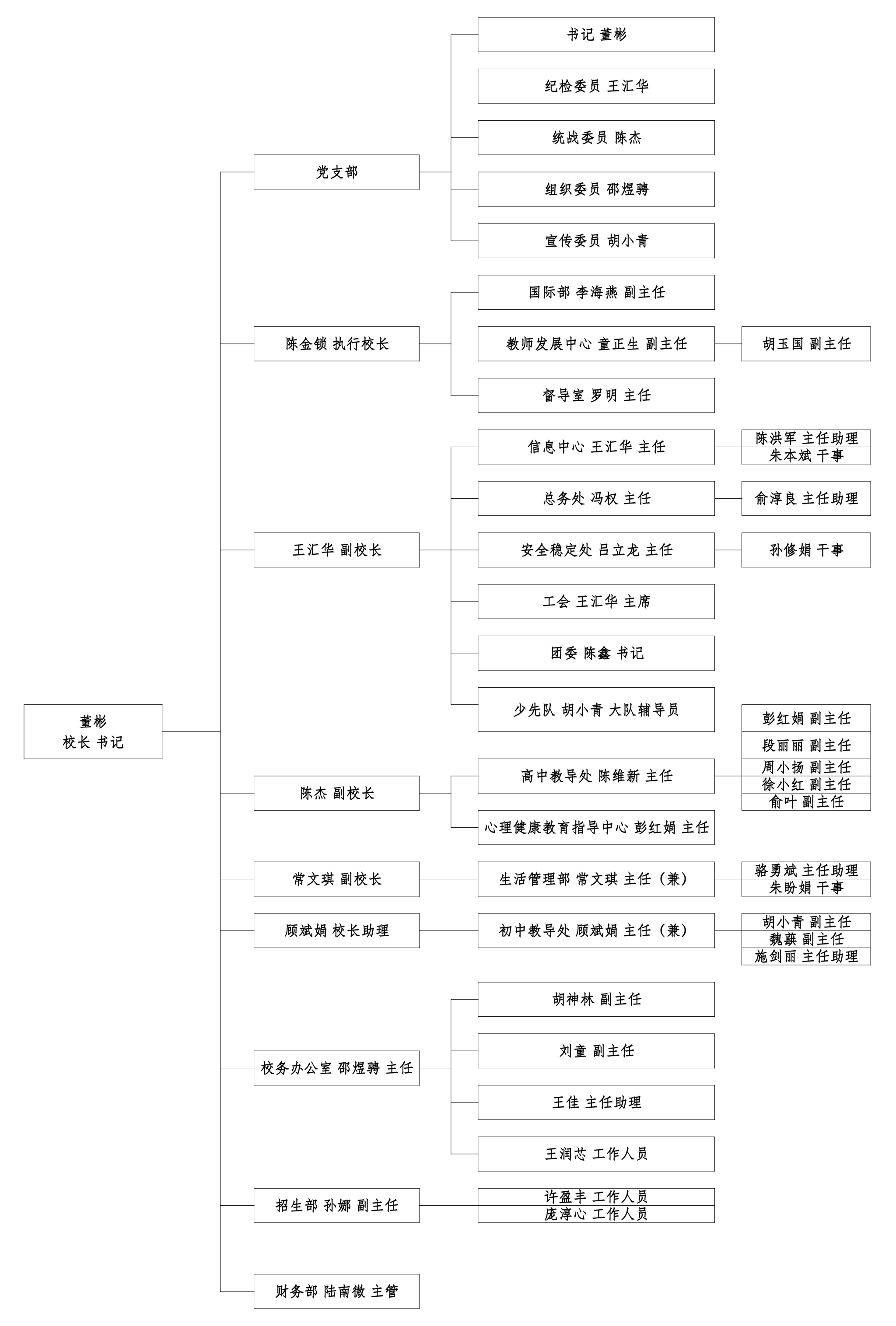 王汇华 | 副校长 | 分管安稳处、总务处、信息中心,协助分管党支部、工会、共青团、少先队、关工委、退协工作。 |