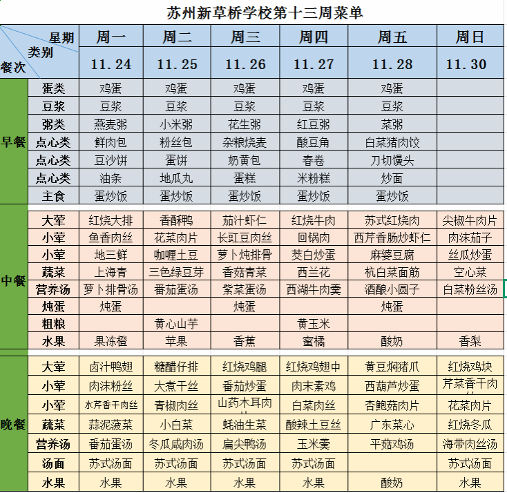 苏州新草桥中学第十三周菜单(11.24-11.30) 来源: 发布时间:2025-11-26 浏览次数: 次 【字体:小 大】 【打印正文】 下一条:2025.6.23-29菜单 [ 2025.11.26 ]