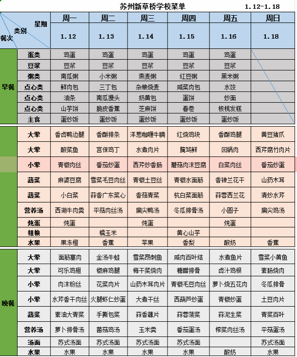 苏州新草桥中学第二十周菜单(1.12-1.18) 来源: 发布时间:2026-01-13 浏览次数: 次 【字体:小 大】 【打印正文】 上一条:苏州新草桥中学第二十一周菜单(1.19-1.25) [ 2026.01.13 ] 下一条:苏州新草桥中学第十八、九周菜单(1.4-1.11) [ 2026.01.13 ]