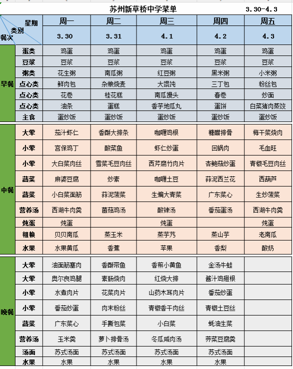 苏州新草桥中学第五周菜单(3.30-4.3) 来源: 发布时间:2026-03-30 浏览次数: 次 【字体:小 大】 【打印正文】 下一条:苏州新草桥中学第二十二周菜单(1.26-2.1) [ 2026.03.30 ]